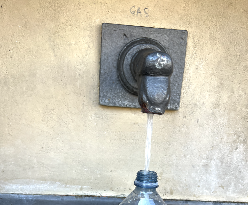 In line for the Medici art gallery, Capelle Medicee, Florence, Italy, there was a public tap, and I thought surely you can’t drink from that. But in the heat, a couple of people went up, filled their water bottles, and it turns out, sure enough they do. In fact they have to be drinking level quality.